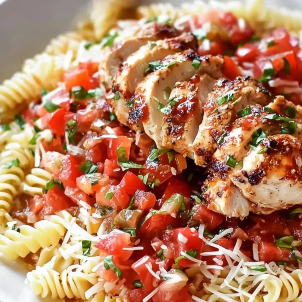 - Divide the pasta and chicken mixture among serving plates. Spoon a generous amount of the fresh bruschetta topping over each serving. Serve immediately, garnished with extra Parmesan cheese and fresh basil if desired.