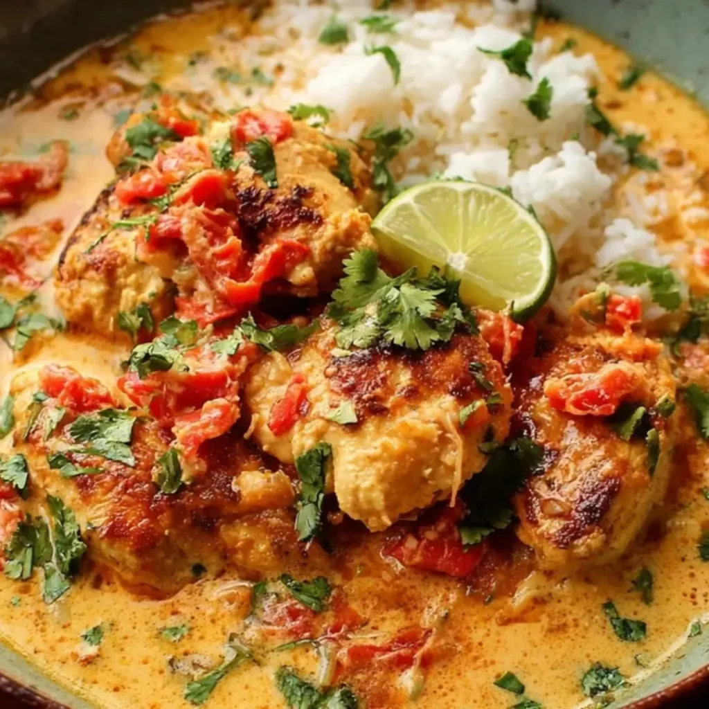 A close-up of seared Coconut Curry Chicken in a skillet, served with rice in a rich, creamy sauce with tomatoes and cilantro.